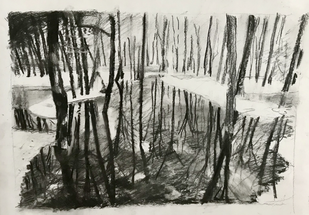 De reflectie in het water en het mistige van de achtergrond versterkt het gevoel van koude van de eerste tekening.