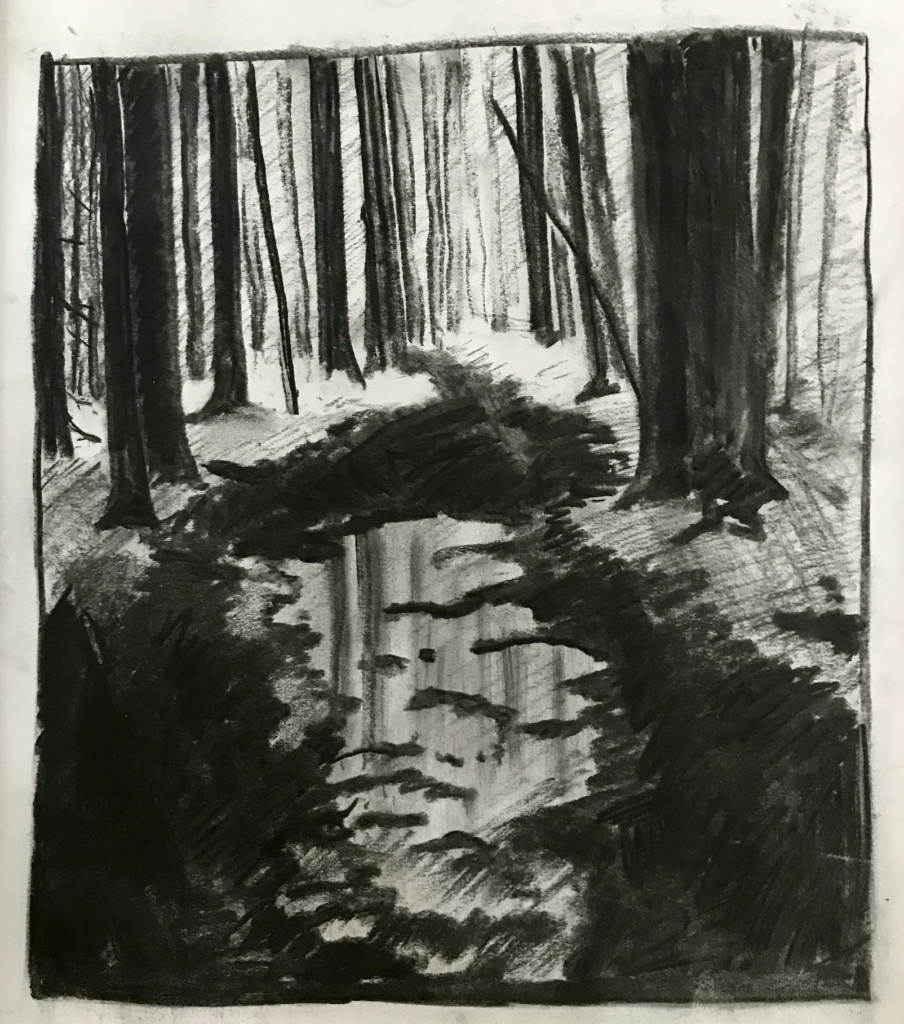 Juist dat soort bespiegelingen maken dat ik het werken met houtskool zo bijzonder vind. Juist het ontbreken van kleur laat dit toe.