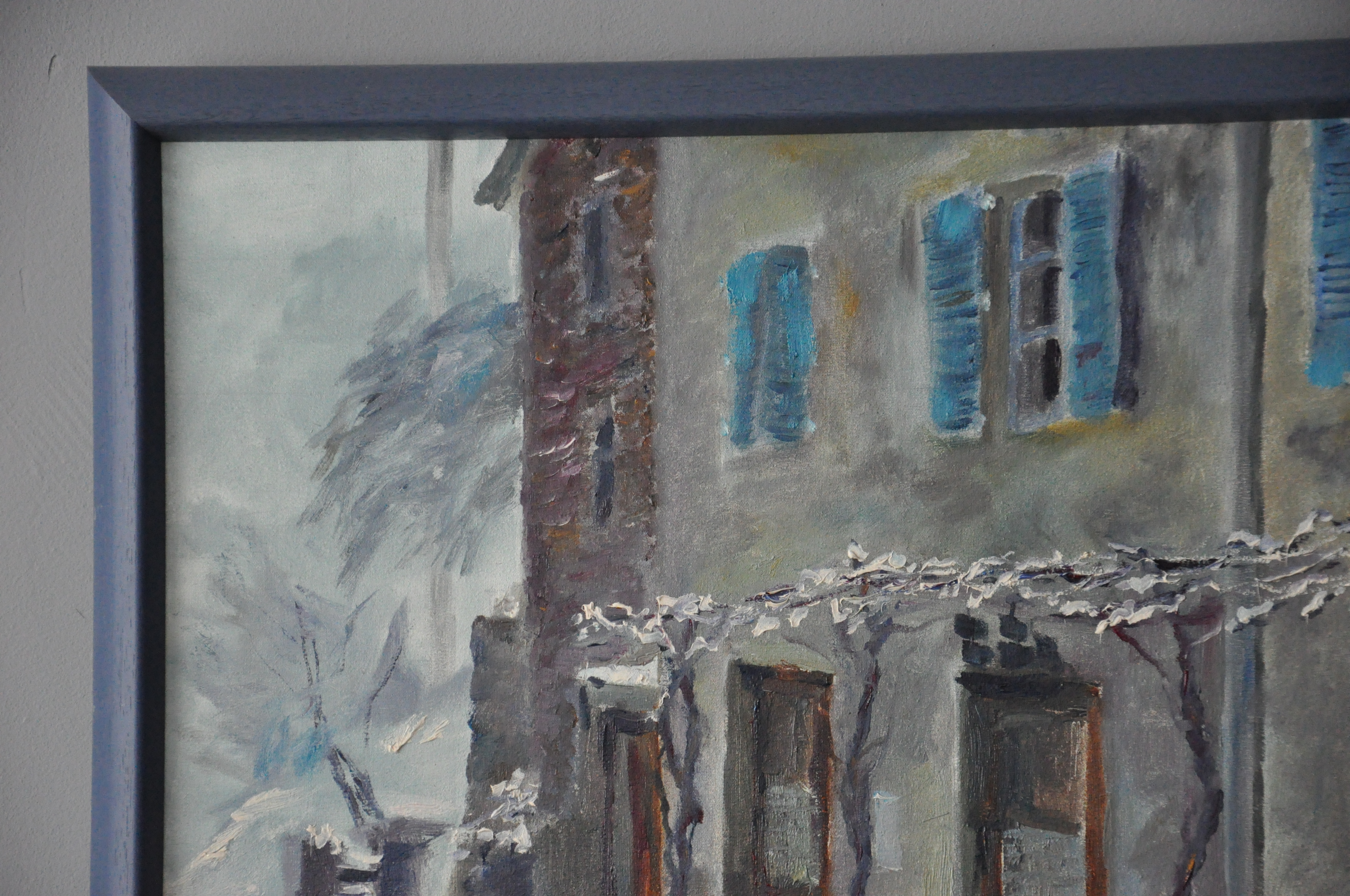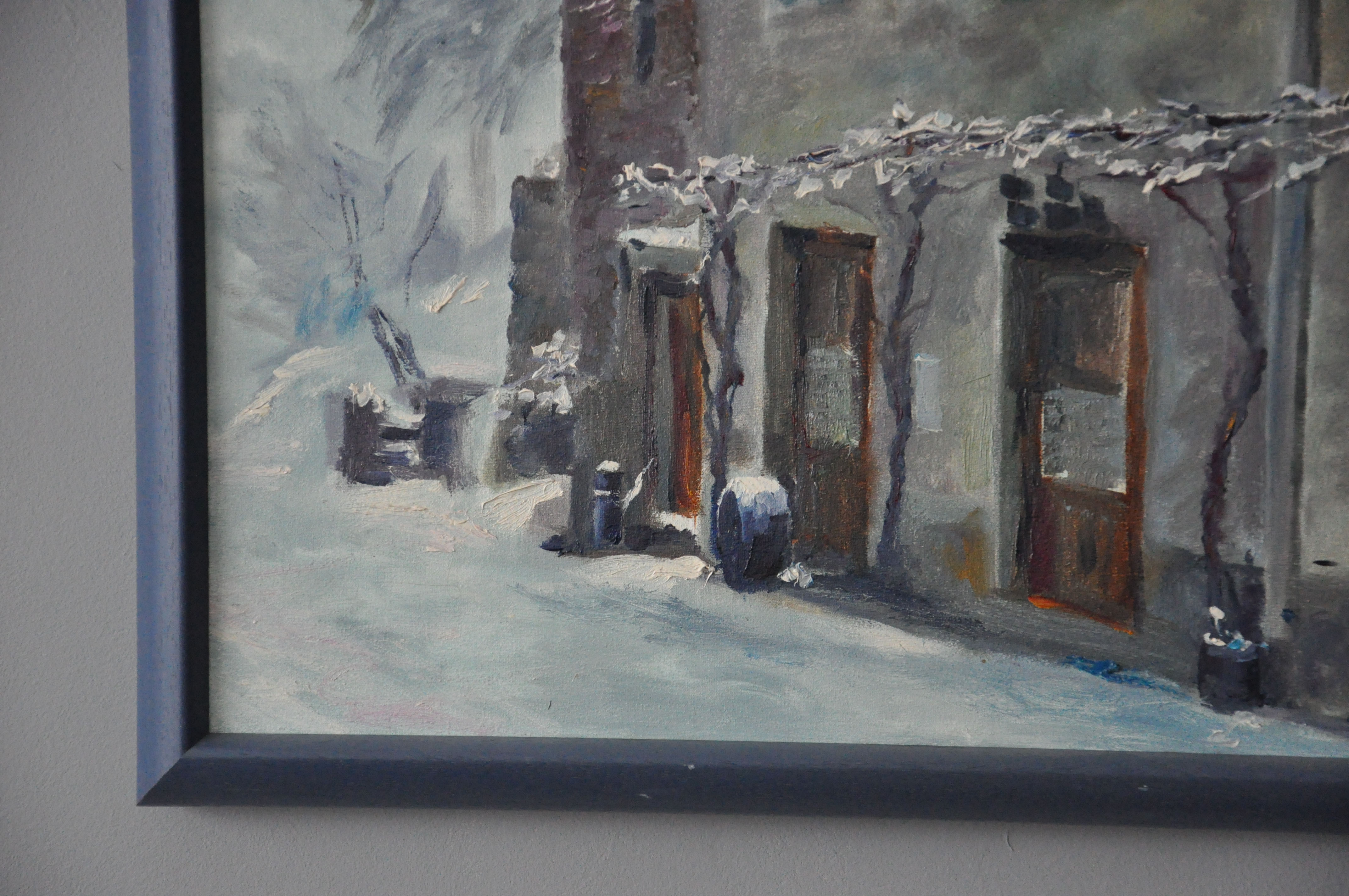 In dit schilderij heb ik getracht de warmte van het café weer te geven dat het ook in de wintertijd uitstraalt, een periode waarin regelmatig de dichtstbijzijnde grotere plaats niet bereikbaar is.