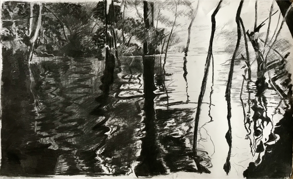 Spelen met de verschillende zwarttonen en grijstinten om de verschillende structuren weer te geven was de uitdaging. Daarnaast vond ik het belangrijk om de overgangen tussen bos, water en lucht te tekenen door het níet weergeven van deze overgangen.